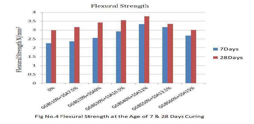 Fig4representsthe7and28days'flexuralstrengthof concretewithpartialreplacementofcementby10%,20%, 30%, 40%, 50%, 60% GGBS & 7.5%, 9%, 10.5%, 12%, 13.5%and15%percentageofSSA.Theflexuralstrengthof GGBSandSSA-basedconcreteisincreasedwhichishigher than 40% GGBS and 12% SSA. Maximum strength is observedfor40%GGBSand12%SSA.Testresultsshowthe flexuralstrengthofconcretevariedfrom2.26to3.33MPa for7daysand2.98to3.77in28daysfor12% ofSSAand 40%ofGGBScontent.