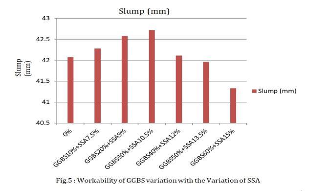 Fig 5 represents the workability of the GGBS and SSA concrete mix. From this fig, it can be seen that as the percentageofGGBSincreasestheworkabilityalsoincreases.