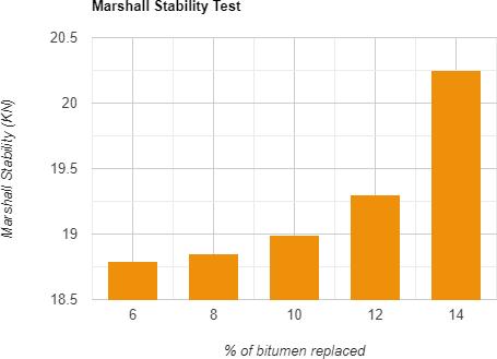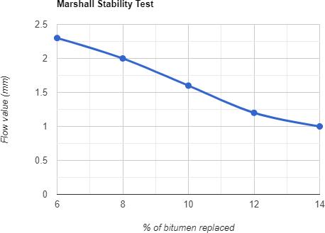 1) From table 1 and 2 it is observed that the marshall stabilityvalueandflowvaluearewithintheprescribe range according to MORTH (Ministry Of Road TransportAndHighwaysfor6%and8%replacement ofwasteplasticwithbitumenthan10%,12%,14%.