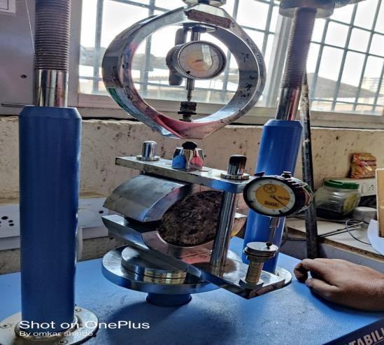 TodeterminetheMarshallStabilityofbituminousmixture asperASTMD1559thistestisperformed.Theresistance to plastic flow of cylindrical specimens of a bituminous mixture loaded on the lateral surface is the principle of marshallstability.Theloadcarryingcapacityofthemixat 600 Cwasmeasuredinkg.