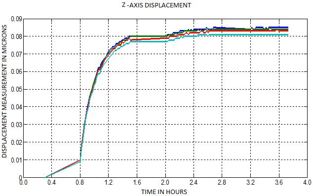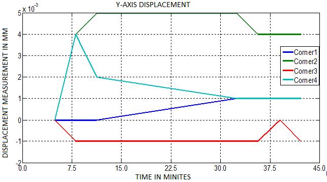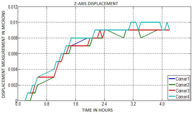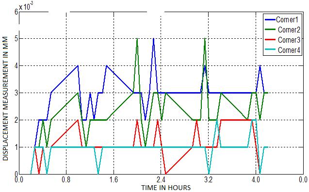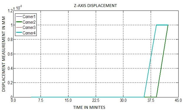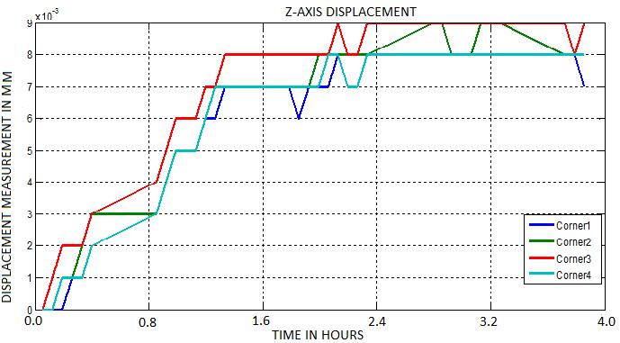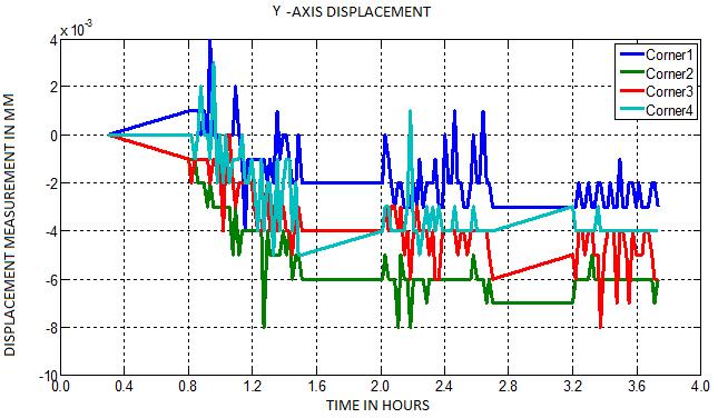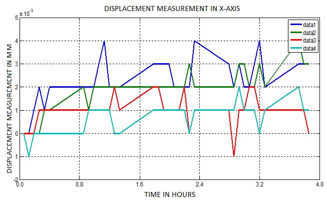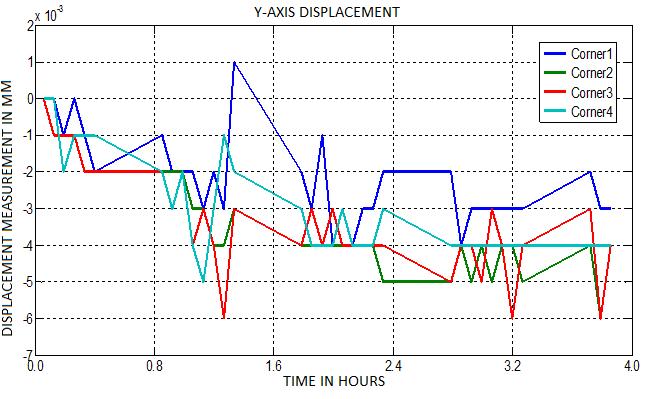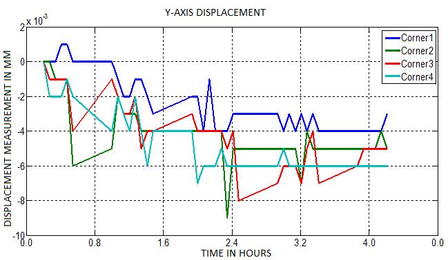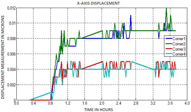 A two-dimensional graphical plot of displacement measurement in microns against time is obtained for the threeaxes(X,Y,andZ)atthefourcornersoftheblockusing MATLAB.