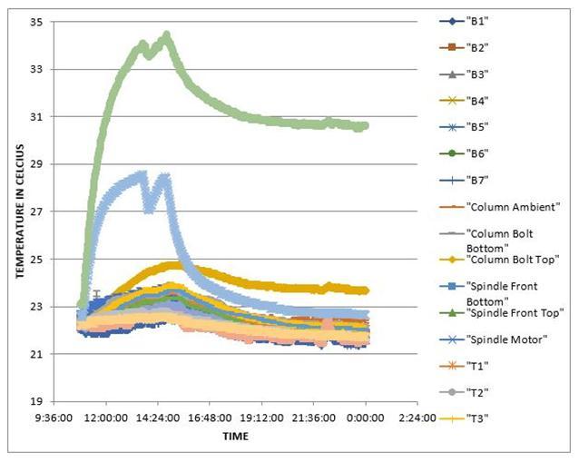 This second experiment sought to go further in not just determiningthedeviationofdimensionfromthedatumover prolongedmachineusage,butalsotodeterminethethermal energyemittedbykeyoperatingcomponentswithtime,such asthemachinecolumn,columnBolt,Spindle,spindleMotor, Z-axis Motor, etc. A total of 24 sensors are used for temperature measurement. A temperature software, ‘TempSpy’samplesthesignalsevery30seconds.