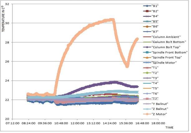 The temperature analysis of the machine tool in this experiment is captured by 24 different sensors affixed to different parts of the machine tool. They capture the temperature data in real-time at a sampling time of 30 secondsandthenanalyseditbytheTempSpysoftware.The graph of Chart 10 indicates the sensor locations and the temperaturemeasurementthroughoutprobing.Itgivesan insight as to how the machine warms up, the component generatingthegreaterheatandthosemostaffectedbyheat, the rate of cooling, and the thermal stability region. The sensorsmonitoredthemachinefromacoldstatewhichis the initial temperature before start-up. This temperature rosegraduallywithveryunstablerippleswhichtook2hours to attain thermal stability. The most substantial rise is noticedinthez-axismotor,whichroseexponentiallyabove theaveragemachinestabletemperatureof22.5Cotoapeak of30.37Coasthemostthermallyaffectedcomponentwithin the experiment period. Other components worthy of mention are the column bolt and Z-ball nut whose temperatures were 23.8oC and 22.9oC respectively at a machinethermalstabilityof22.5oC.