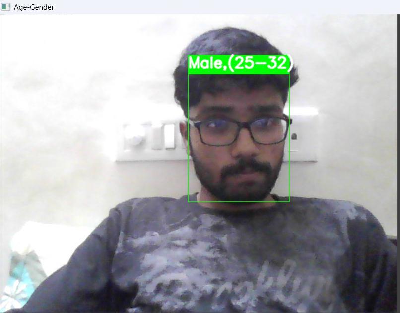 Launch the path of the code directory into the commandprompt.Thenthepathtothelocationofthecode has been set. Now, execute the code using the command python filename.py. The project window appears on the screen which begins to identify the object in front of the webcam.Iftheobjectisidentified,thealgorithmclassifies thegendertypealongwithagegroupasshowninbelowfig9.1
