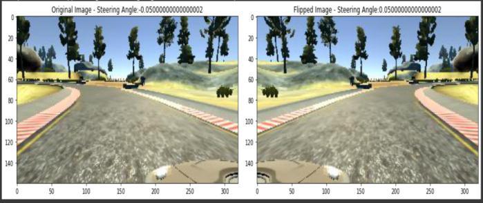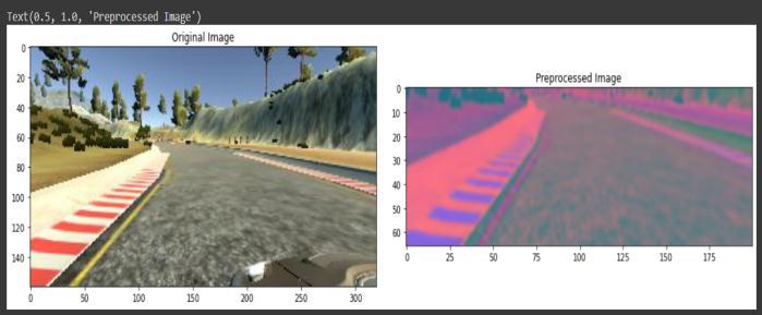 Preprocessing of data for faster and more efficient traininganddeployment.Thisworkpresentsatwo-stage preprocessing function that performs resize and normalize operations (with moderate centering) on the input image. This is one of the important steps. Because weknowtherearemanyareasoftheimagethatwedon't use,orwecantellthatwedon'tneedtofocusonit,sowe removedtheimage.FeaturessuchastheSkyMountainin the photo and the hood of the base vehicle. These parts have absolutely nothing to do with our car determining thesteeringangleofhis.SoItrimmedthiswithasimple NumPy array slice. As you can clearly see in the image, theimageonaxisis160x300,theheightfrom160to135 isthecarhood,andtherangefrom60to0istheskyand landscape. So I removed that part from the photo and changed the axis from 60 to 135. This allows them to focus more on its essential functions. Convert the RGB image to YUV using the CV2 library. The advantage of converting images is that YUV images require less bandwidth than RGB. After transforming the image, I smoothitusingtheGaussianBlurmethodprovidedinthe CV2library.