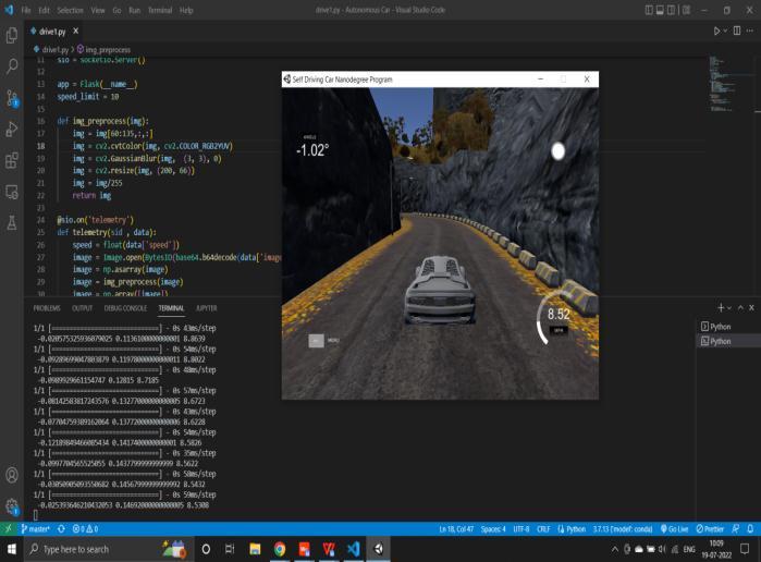 stimulateadrivingscenarioimplementedusingCNN with an activation function that is Elu. The Elu function uses a mean squared error loss of used to validate the data. As expected,performedbetteraftertrainingthedata,butthe twovaluesinthetrainedandtesteddatawereveryclose, leading to the conclusion that the model represents a moregeneralquality.Hereisthe resultafterapplyingthe above method: The car drives that route and you can see that the right corner of is the speedometer. A trained model can successfully drive a car on a variety of unknown tracks. This model is able to consistently wrap withoutfailure.Usingalargetrainingdatasetconsistingof different scenarios improves the ability of the model to stayinautonomousmode Hereistheresultafterapplying theabovemethod: