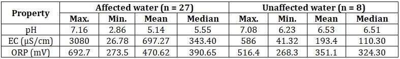 Generally,thechemicalprocessesofAMDismainlyinfluence by the pH. In unaffected water, the highest pH value measured was 7.08 while in affected water, the lowestpH measuredwas2.86.ThepHvalueinthestudyareaincreased downstream of the Banas river because unaffected water flowedintotheaffectedwater.