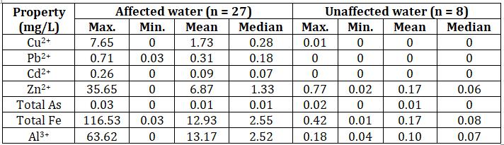 TheaffectedwatercontainshighconcentrationsofCuandZn withlowconcentrationsofCd,AsandPb.