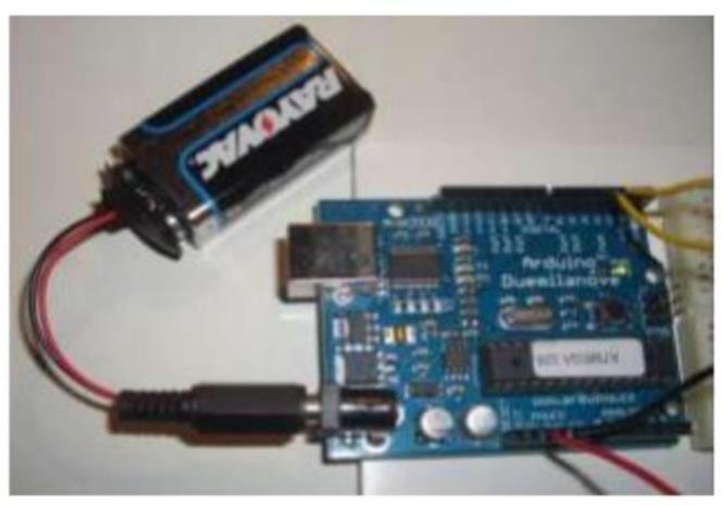 While the external powercanbeanywhereinthe range of 6 to 24 V (for example, you could use a car battery), a standard9Vbatteryisconvenient.Whileyoucouldjamthe leadsofabatterysnapintotheVinandGndconnectionson theboard,itisbettertosolder thebatterysnapleadstoa DCpowerplugandconnecttothepowerjackontheboard. DisconnectyourArduinofromthecomputer.Connecta9V battery to the Arduino power jack using the battery snap adapter. Confirm that the blinking program runs. This showsthatyoucanpowertheArduinofromabatteryand that the program you download runs without needing a connectiontothehostPC.