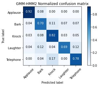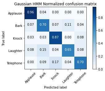 AcrossthethreemodelsitisobservedthattheperformanceofthemodelisbestfortheclassApplausewithgood performance for Knock as well. The less complex Gaussian HMM shows similar performance to GMM-HMM for the Applause,BarkandKnockclasseswiththebiggestimprovementoftheGMM-HMMshownfortheTelephoneclass.Thetwo GMM-HMM models with different parameters show minimal difference in performance. All three models show the tendencyto misclassifyTelephonesoundsas Knock sounds. The ensemblemodel combiningthese three modelsensures that even if one of the models predicts the wrong class, the other two models’ predictions are taken into account and so therightclassispredictedmoreoften.
