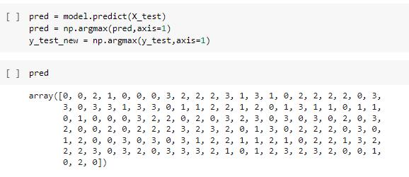 Prediction:Simplysaid,thepredictionentailshighlighting the aspects of the data that have the most bearing on the results of the model. Each row from the prediction array, whichcontainsfouralternativevaluesforthecorresponding labels, has been processed using the argmax function. by using the argmax function, we are able to determine the indexassociatedwiththeprojectedoutcomeasseenbelow. Thelargestvaluethatisin eachrow reflectsthe expected outputoutofthefourpotentialpossibilities.