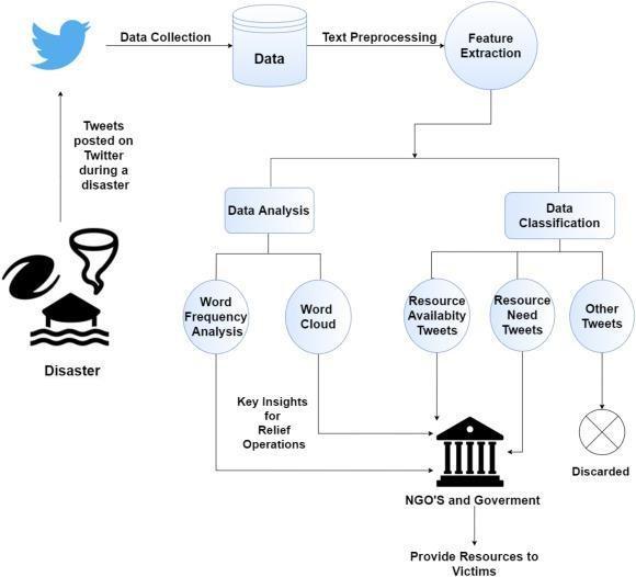 Duringanyemergencysituation,TwitterorFacebookserve asaplatformforinformationdissemination.Location,user, incident type, personal harm, and infrastructure damage areall included in thisdata. The informationindicatesthat the crisis is under control and For rescue operations, damage and location estimation is done. However, it is tough to rescue because of the speed and volume of information that come at one, making it harder to distinguish vital information from irrelevant. Our model aims to automatically extract important information and classifications.
