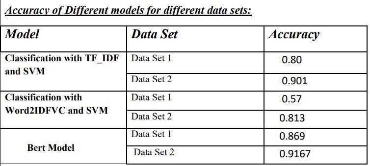 WecaninferfromthistablethattheBERTmodelhasmore accuracythanthe other two models for both data sets. For dataset 1, the accuracy of TF IDF and SVM is.80, and when we train and test the model using further data sets, the accuracyrisesasaresultoftheadditionaldatasets.Dueto the second model's use of less data than the first, we see thatdataset2'saccuracyishigherthandataset1's.Lastbut notleast,ourBERTmodelhasamaximumaccuracyof.9167 andgreataccuracyinbothdatasets.