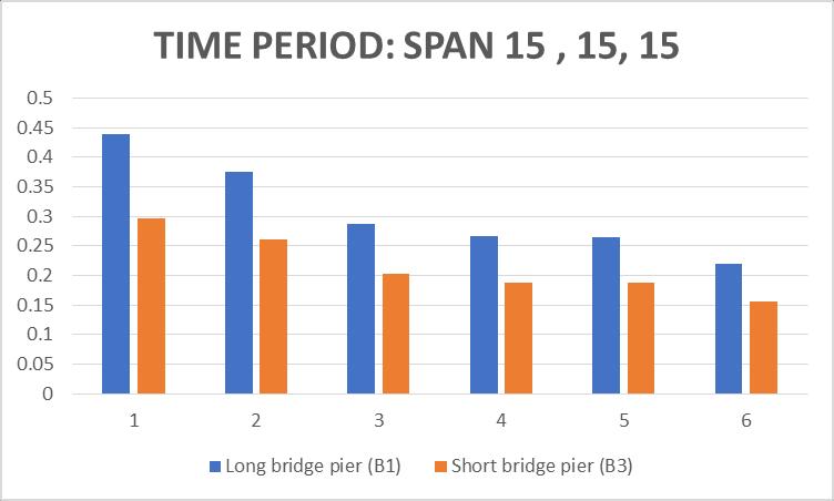 As we can see in the above chart, it shows approximately span time period of 15, 15, 15 for long bridge pillar (B1), shortbridgepillar(B2).Themaximumtimeperiodshowsfor the long bridge pier (B1) and the minimum results for the shortpier