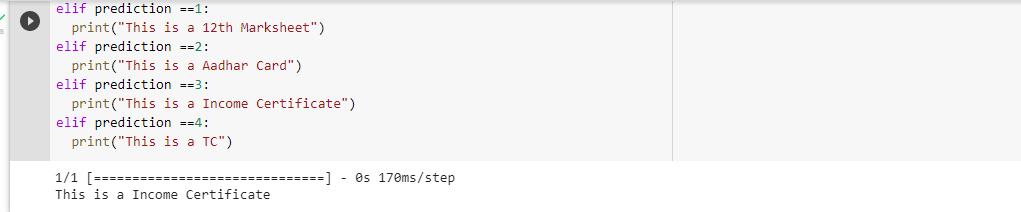 Aswehaveuploadeddocumentasshownintheaboveinputphaseforthepredictionofthedocumenttype.Wegotadesire predictionasshowninbelowsnapshot.