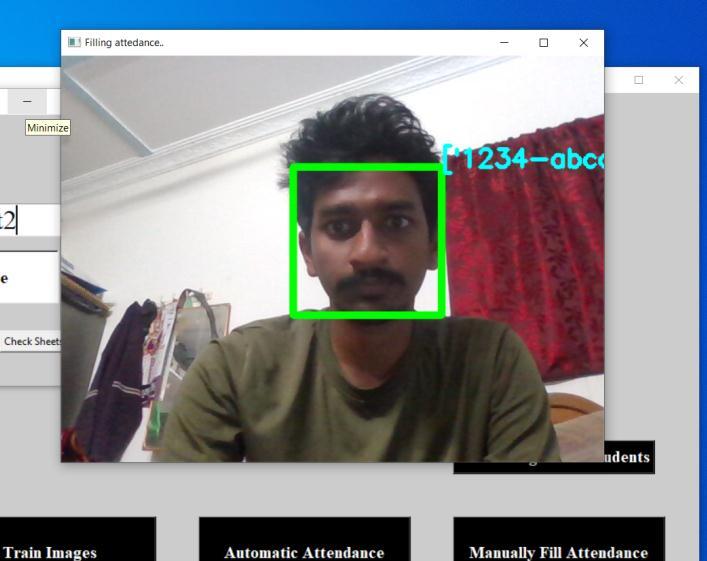 Firstlyacameraisfixedattheentranceoftheclassroomor working hall. when ever a person is moving into the classroomfacedetectionisdonebythecamerathatisfixed attheentrance.UsingLBPHAlgorithmFacerecognitionis done and the identified face is matched with the details present in the dataset. when the faces are matched the attendaceofthestudentaremarkedinthedatabase.When thereisafailureinthecamerathereamodulecalledmanual