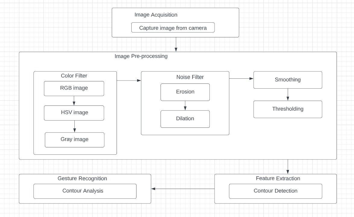 Theproposedsystemisvision-based,anditemploysimageprocessingtechniquesandinputsfromacomputerorwebcamera. The input frame would be obtained from the web camera, and the system would be split down into four stages, object detection,handcontourextraction,andtheskinregionwouldbedetectedvictimizationskindetection.Thehandshapewould thenbediscoveredandusedforgesturedetectionandhandtrailing.Handmovementswouldbeusedtoaccomplishmouse actions such as right click, left click, scroll up and scroll down, and hand trailing would be used to navigate the Personal Computerpointer.Asaresult,theproject'sgoalwouldbetocreateavision-basedCCsystemthatcandoavarietyoftasks.The suggestedsystem'sarchitectureisdepictedinthediagrambelow.