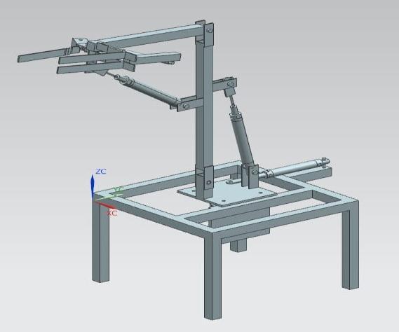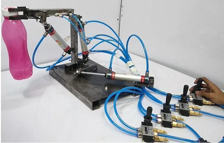 Theprojectentailsthedesign,construction,andpneumatic circuitry of a 3-DOF robot. This design served as the inspiration for the robot's fundamental mechanics. Following pneumatic cylinder selection, the required link lengthsweredeterminedandmadeusingcarbonsteelbars. Thefinaldesignoftherobotisasfollows.Thedesignofthe robot underwent significant changes throughout the assembly.