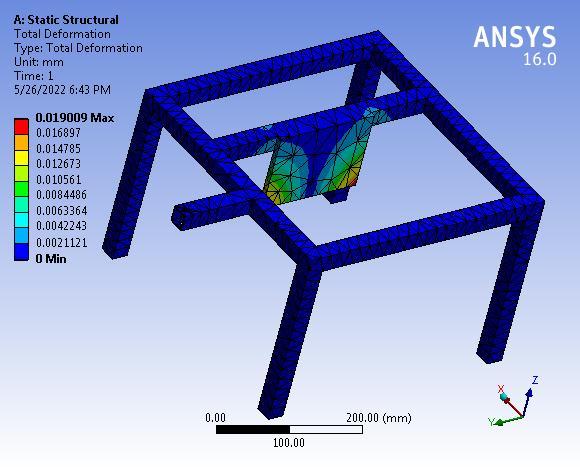 The maximum deformation is 0.019 mm which is very negligiblehencethebaseframeissafeunderagivensystem offorces.