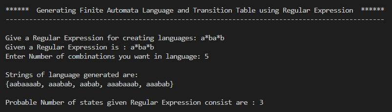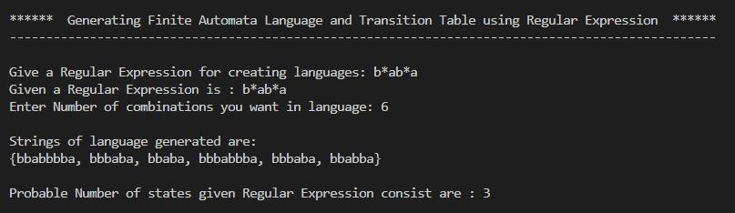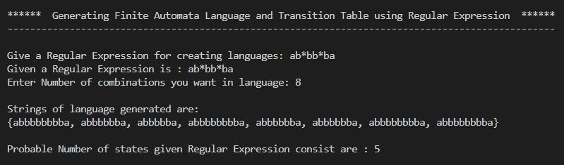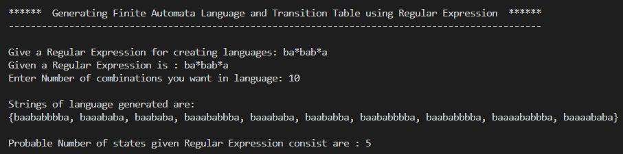 Users first needed to provide regular expressions as input to the program and then input a number of combinations of strings in language. If entered regular expression is valid regularexpressionthenprogramwillprintstringcombination andprovablestatesofDFAasoutputofprogram.