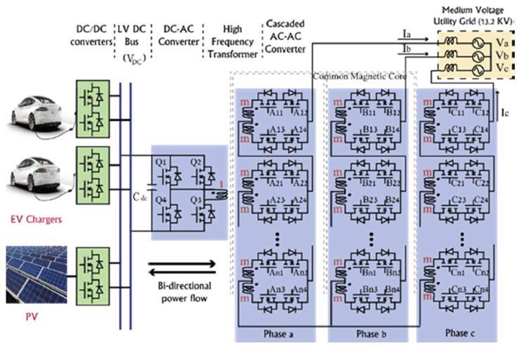 The creation of high-power electric vehicle (EV) fast chargingstations(EVFCSs)thataredirectlyconnectedtothe medium-voltage(MV)gridisapossiblemethodforreducing EV charging time. The charging station's cascaded-highfrequency-link(CHFL)technologyoffersanisolatedpower electronicinterfacebetweenthestation'slowvoltage(LV) DC bus and the three-phase MV AC power network. A