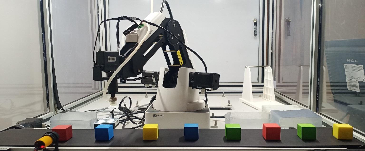 Keywords- Dobot (Robotic arm), pick and place, colour sorting, stacking, 3D printing, laser engraving, writing and drawing.