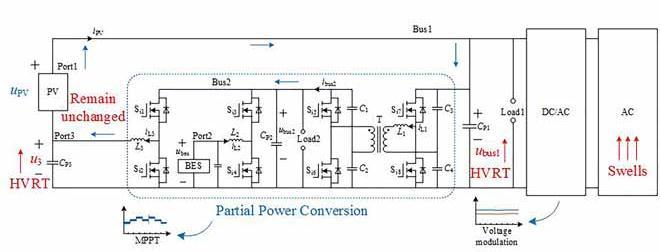 From fig 2: For a PV array's maximum power point tracking to be effective, the voltage at Port 3 (u3) must be dynamically adjusted to maintain a constant maximumpowerpointatthearray'soutput.Thiskindof partial power conversion uses a non-isolated converter to actualise the PPC, which boosts energy transfer efficiency. When only a fraction of the power is converted, this process is called partial power conversion (PPC). Compared to Full power conversion (FPC), which transfers 100% of the power, this method only assigns a portion of the energy. Realising the PPC with non-isolated converters can increase energy transfer efficiency while decreasing the system's size, weight, and price. The proposed PPC scheme in this papercanalsoassistincarryingouttheHVRTunderthe grid voltage surge condition. After all the loads are connected to the DC bus via a power electronic converter, the voltage on Bus 1 uBus 1 may fluctuate within a certain range. As AC side voltage spikes are detected,theDC bus voltageuBus1can beincreasedvia Port3tocompensate.The MPPTcontrol determinesthe PV output voltage uPV, and the DC bus voltage uBus1 is foundbyaddingthevoltageatPort3(u3)tothevoltage at the PVs (uPV). As the DC side of the three-phase converter experiences a voltage spike from the grid, the voltageatPort3(u3)shouldbeincreasedtokeepthePV system working at the MPPT. If there is a high-voltage failure, the voltage on Bus 1 will need to be raised to