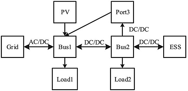 TheDHBbidirectionalDC/DCconvertersendsthepower to Bus 1. When the BES discharges, the energy is transferred to Bus 1 through the DHB converter if the following equation is true: QBES − Qu3 − QLoad2 > 0. Here, QBES is the power output of the BES, Qu3 is the power output of the PV port, and QLoad2 is the power outputoftheloadconnectedtoBus2.Ontheotherhand, if the equation QBES − Qu3 − QLoad2 < 0 is true, then the energy is transferred to Bus 2 through the DHB converter.TheenergyistransferredtoBus2throughthe DHBconverterwhentheBEScharges.