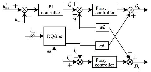 The control scheme of Bus1 voltage uBus1 is shown in Figure3.Voltageandcurrentdoubleclosed-loopcontrol areusedinthegrid-connectedcondition.Sincereference values id,iq and feedback values id,iq are DC signals in steady state, current tracking control without steadystateerrorcanberealisedthroughtheFUZZYcontroller