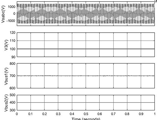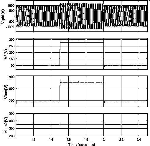 Case II: As shown in Figure 12, during 0-1s, the BES is charged with a constant current of 30A, and all loads in the system are switched into 10• ; during 1-1.5s and 22.5s, the BES discharges at a continuous current of 30A, and the DC bus is not connected to the load. The output current of the PV is increased to 30A. During 1.5 2s, basedontheoperationinthelastworkingcondition,the grid voltage rises. Under the normal operation state of grid voltage, DC bus voltage uBus1 is 700V; DC bus uBus2is400V.ThePort3voltageu3is100V.During1.52s, the grid voltage rises, and the DC bus voltage uBus1 is stable at 860V, while the Port 3 voltage u3 is stable at 260Vasshowninfig13.