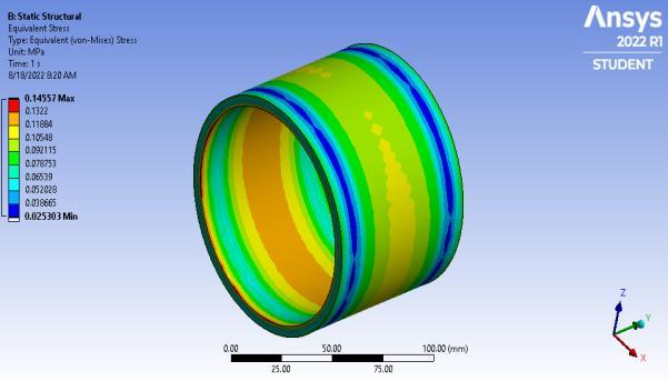The equivalent stress plot is generated on bearing as shown in figure 9 above. The maximum equivalent stress obtained is at the corner edge of the bearing with .14663MPa.