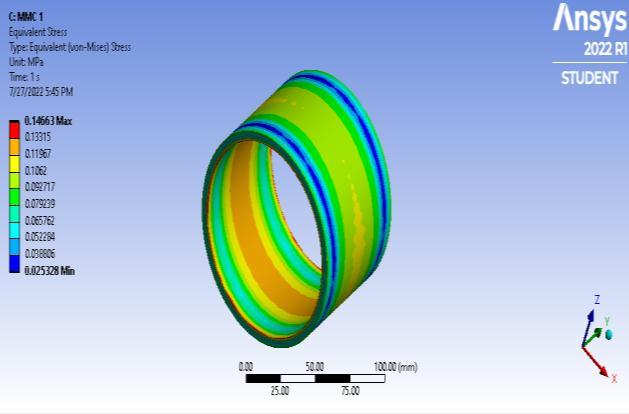 The equivalent stress plot is generated on bearing as showninfigure6above.Themaximumequivalentstressis obtained onthe open free endsof bearing. The equivalent stress distribution pattern is in close agreement with the equivalent stress distribution shown in literature. The maximum equivalentstress obtainedisatthecorneredge ofthebearingwith.14557MPa.