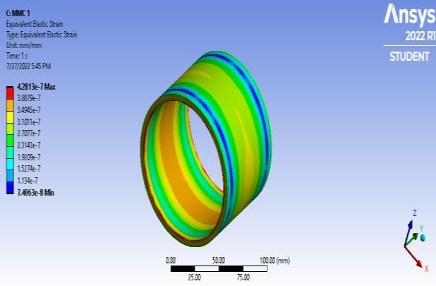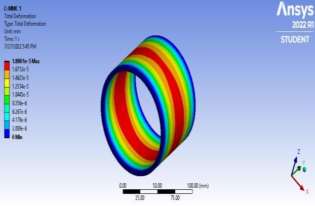 The equivalent elastic strain plot is generated on bearing as shown in figure 7 above. The maximum equivalent elastic strain obtained from the analysis is 7.27mm/mm. The total deformation plot is generated for bearing made of P100/6061 Al as shown in figure 7. The maximum deformationisobtainedatthecenterofthebearing.