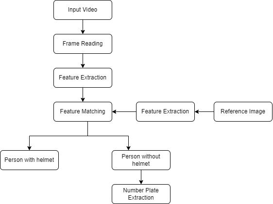 In this, we take an input video that is to be analyzed in which we have to check whether the people riding twowheeler are wearing helmets or not. Then the video is analyzed frame by frame from which the features are extracted.Thenthefeaturesextractedfromtheinputvideo are matched with the data set loaded for training the program. As the features match the program looks at whether the people driving the wheeler are wearing helmetsornot.Ifsomebodyisnotwearingthehelmetthen thenumberplateisdetectedandthenitisextracted.