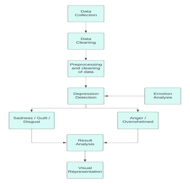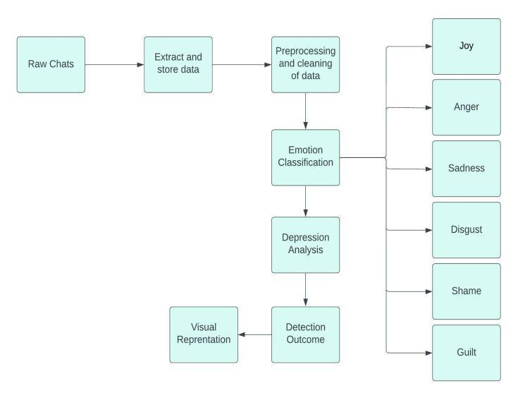 Toincorporatetheproposedemotiondetectionmethod intoasystemfordetectingdepression,severalstepswould needtobetaken.First,itwouldbenecessarytocollectand label a dataset of text data that is relevant to the task of depressiondetection.Thiscouldincludesocialmediaposts, online reviews, or other types of text data that contain expressions of emotion. The dataset would need to be carefully labelled with information about the presence or absenceofdepression,andwouldneedtobelargeenoughto providesufficientdatafortrainingandevaluation.