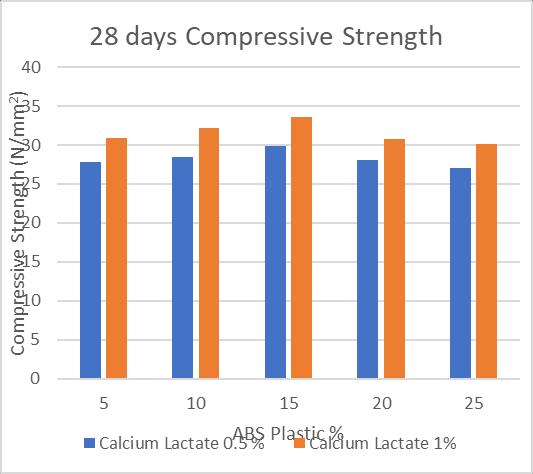 Thecompressivestrengthofthesamplesshowagainshowa similartrendafter28daysofcuringduration,i.e.itincreases withtheincreasingcompositionofABSplastictill15%after whichitsstartsdecreasingagainascanbeseeninthetable and the graph above. It also increases with higher percentage of Calcium Lactate composition, as the compressivestrengthsoftherespectivesampleswithsame percentageofABSplastichasbeenobservedtobehigherfor 1%Calciumlactatecompositionthan0.5%ofit.However, thecompressivestrengthhasbeenfoundtobemaximumfor 15:1compositionoftheABSPlasticandtheCalciumLactate, respectively,i.e.33.62MPa.