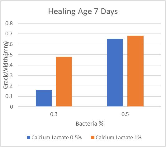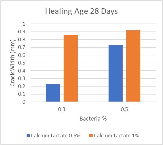 Morecalciumlactateandbacteriaarepresent,the widerthefracturethatcanbemended.Maximum crackhealingwasseenwith1%calciumlactateand 0.5%bacteria,withawidthof0.68mmafter7days and0.92mmafter28days,respectively.