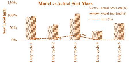 One of the significant portions of soot regeneration is calibrationrobustness.ItisvalidatedbasedontheDPFsoot loadingaccuracy.Theengineisoperatedonvariousvehicle dutycycles,takenfromdifferentfieldapplications,andatthe endofeachdutycycle,theactualsootloadismeasuredby weighingthedieselparticulatefilter(DPF)alongwithsoot. Themodel-basedandactualsootestimationsarecompared foreachdutycycle.Figure5showssootestimationaccuracy forvariousdutycycles.TheDPFaccuracyisobservedtobe within ±20%. Accordingly, based on these variations, the conditionsforthesootregenerationstrategiesarefinalised andvalidationforfurthertestsiscarriedout.