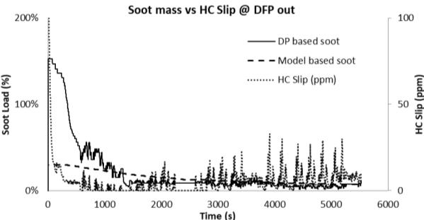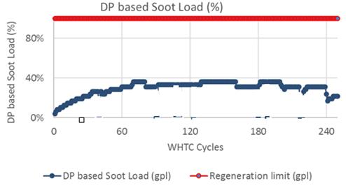The WHTC (World Harmonized Transient Cycle) test objectiveistocheckthebehaviorofaDPFsystemintransient operatingconditionsforalongduration. Thistestconfirms the soot regeneration interval. Figure 6 shows the delta pressuresootestimationforWHTCtestcycle>100hrs.Based onsootaccuracy control,themeasuredsootlevelisbelow 40%. Furthermore, passive regeneration of soot is accomplishedmostofthetimeduetothefavourablecatalyst temperatureattheDPFinlet.