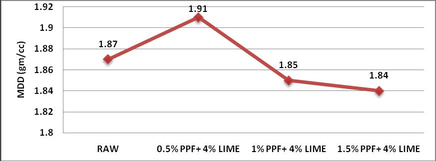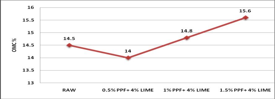1) Whenwestabilizedtheredsoilwith0.5%PPFand 4% lime, OMC decreased to 14% and MDD increasedto1.91gm/cc.Thenafterincreasingthe Percentages of PPF and lime OMC value goes on increasingandtheMDDvaluedecreases.Fromthe Compaction Point of view, 0.5% of PPF and 4% Limegivesthebestresult