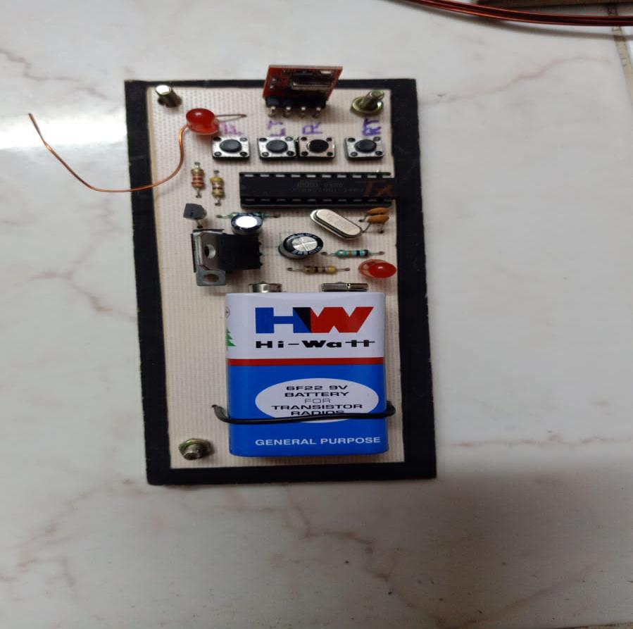 TheinputpinoftheRFtransmitterreceivestheoutputofthecontrollerchip.Thedeviceproducesahighfrequencyof433 MHZ, which is utilised as the carrier frequency. The controller output is now sent to this high frequency as a modulated signal,whichismixedwiththecarriersignalanddeliveredbyanantenna.Whenasignalisbroadcastviaanantenna,the digitalsignalisoverlaidoverthecarrierandsentasamodulatedsignal,whichmeansthecarrierdeliversthedigitalcode signal to its destination. A tiny electrical component called an RF module is used to transmit and receive radio signals