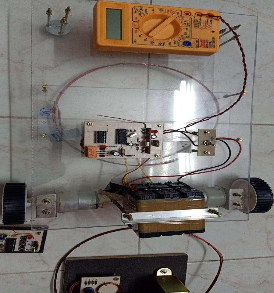 Thewirelesschargerelectriccarmodelhasbeensuccessfullyfinished.Becausethemajorsidepowersupplyisconstrained because it is a prototype module, a low power transmitter is built. Economy is a factor in addition to power supply, however after carrying out so many trials, weare extremely certain that we can construct a high power transmitter and enhancerangeproportionately.Resonantcircuitsmadeofinductanceandcapacitancemustbeturnedoffinorderforthis projecttofunction.Thesetwodevicesdeterminetheoutcome,andanothercrucial factoristhefrequencyatwhichthese devicesareoperatingefficiently.Tobeprecise,wediscoveredthatformulaeareineffectiveandtheonlythingthatmatters istokeepusingthem.