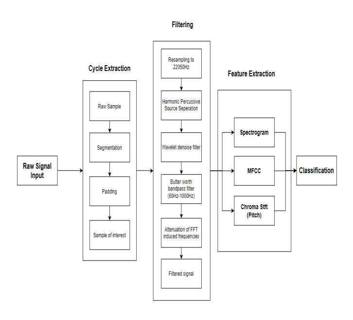 The process of preprocessing and feature extraction is divided into 3 parts i.e Cycle Extraction, Filtering and Feature Extraction. We standardized the audio clips coming from different sources by resampling them to 22050Hz.therawsamplethenundergoessegmentation to capture a single breathing cycle per clip and zero paddingtomakeeachclip 6secondslong. Ifoursample consists of noise, it will lead us to inaccurate results. The audioispassedthroughtheHarmonic-PercussiveSource Separation Filter to reduce the ambient noise, Wavelet denoise filter, Butterworth band pass filter [60Hz to 1000Hz]toremoveunwantedfrequencieswhichmaybe caused by the heart beats. The Butterworth bandpass signalinducesverysmallnoiseintheformofvaluesclose tozeroforthezeropaddedsegmentoftheaudioclip.This istheresultofthe FFTalgorithmonZero values,hence thisnoiseisattenuated.Afterthesestepsoffilteringthe audiosamplesarereadyforclassification.