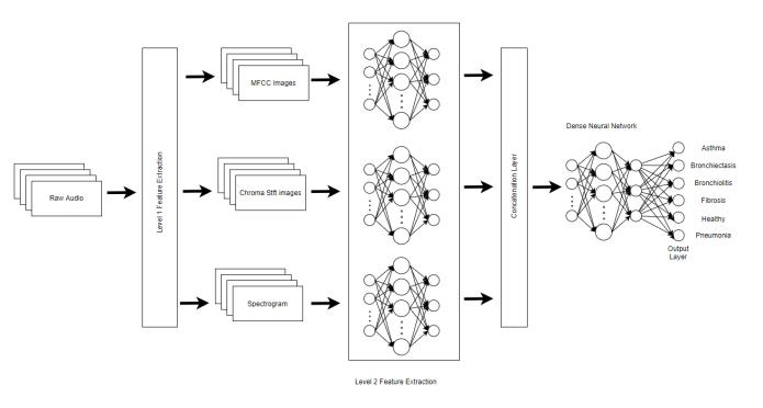 Theproposedsystemuses3featurestoperformtheanalysis. This architecture allows us to gather information from different audio domains and incorporate them into one aggregatedoutput.TheLevel1featureextractionisusedto extractthefeatureimages(visualization)fromtherawaudio. TheseimagesarepassedontotheLevel2featureextractors which are tailored CNN models which learn the essential features from the images. These models are concatenated togetherandpassedonasinputtoaMulti-LayerPerceptron whichgivesfinaloutput.