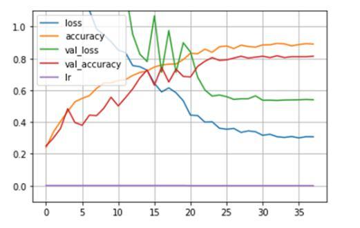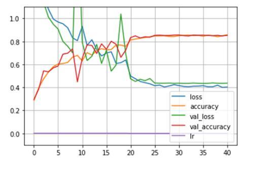 Preliminarymodelssufferedfromoverfittingissue.Thetrain accuracy reached up to 99% while validation accuracy couldn’t go past 85%. This issue was resolved using callbackslikeEarlyStoppingwithbestweightandLearning Ratereduction.