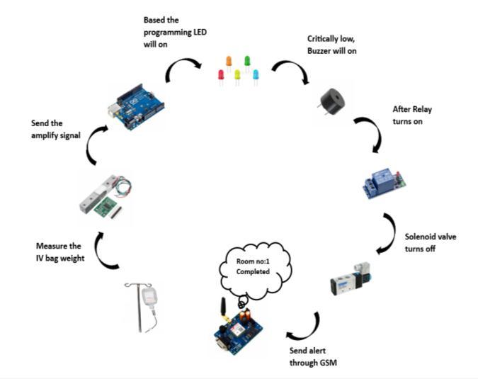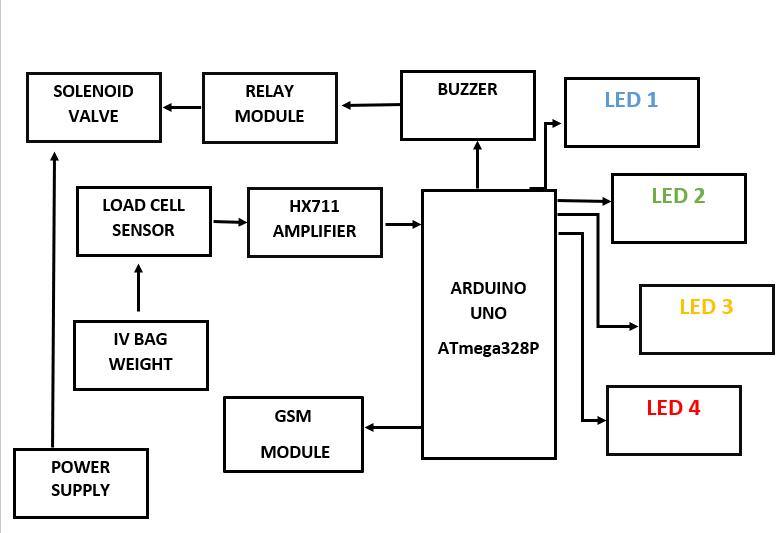 The system is made up of an Arduino Uno, a Load cell sensor, a Load cell Amplifier, a Solenoid valve, a GSM module,aBuzzer,andfourdifferentcolorsofLED.TheIV bagweightismeasuredbytheloadcellsensorswhichare fastenedtothedripbottle'stop,andthedataisamplified byaloadcellamplifier.BotharemanagedbyanArduino Uno, which allows for quick programming division and warningsviaanLEDandbuzzer.Basedonthefluidlevelin theIVbag,ifitislessthan10%,thebuzzerwillactivate.