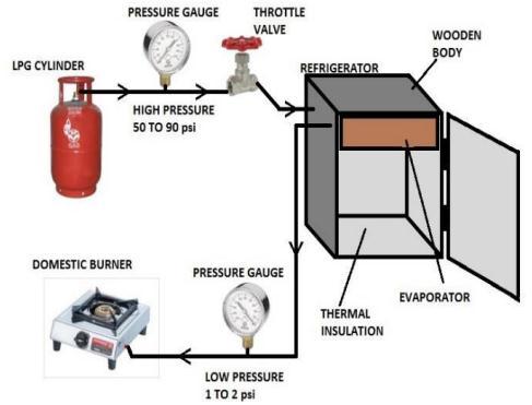 To study and analyze the vapour Compression Refrigeration system is our basic objective. We are substituting the compressor and condenser by a LPG cylinder.ThepressureenergyofLPGisveryhighasitcanbe compressedupto12.5barsandhencethispressureenergy of LPG can be used for refrigeration by usage of this LPG systemisalsoverylow.(16)