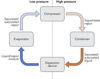 Process3-4:Hotvapourfromcompressorunderpressureis discharged into the condenser where condenser cooling medium usually water orsurroundingair isabsorbing the heat from hot vapour. This converts the hot vapour into liquidandtheliquidiscollectedinliquidreceiveratstate4.