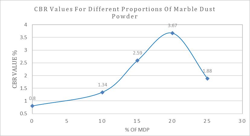 Fromtheabovetableandgraphsit’sclearlyobservedthat theCBRValueoftheMarineClayincreaseswithincreasing theamountofMarbleDustPowder.TheCBRvalueincreases from0.86%to3.67%whenMarbleDustPowdercontentis increasedfrom0to20%.