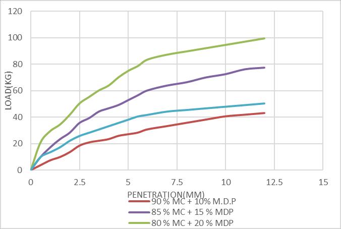 TestspecimenispreparedbymixingofMarbleDustPowder indifferentpercentagesbythedryweightofsoilandMDP wasmixedthoroughlywithequivalentdryunitweightand optimummoisturecontentwhichisobtainedfromproctor test.MixedsoilsampleisplacedinfivelayersinCBRmould havingdimensionsof150mmdiameterand175mmheight andeachlayeriscompactedby55blows.Thepreparedsoil sample is soaked for four days.The loads necessary for 2.5mmand5.0mmpenetrationwerenotedandhighervalue isconsidered.